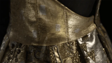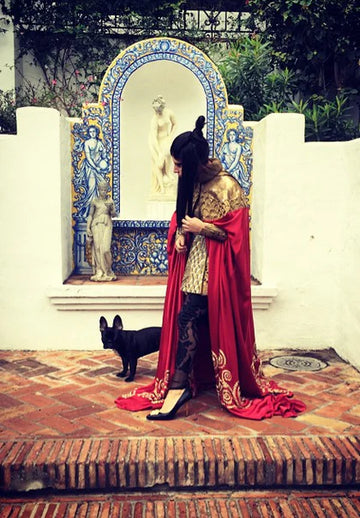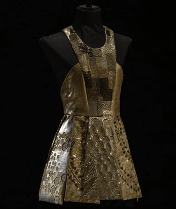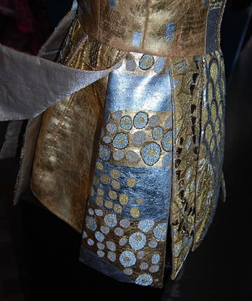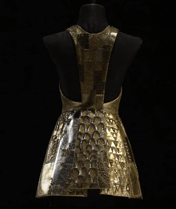The outfit is composed by a dress, a cape, the boots and some accessories, all made with Portuguese cork, coated with gold and silver leaf, hand-embroidered with metallic threads, and designed and created by skilled Portuguese and Indian artisans.