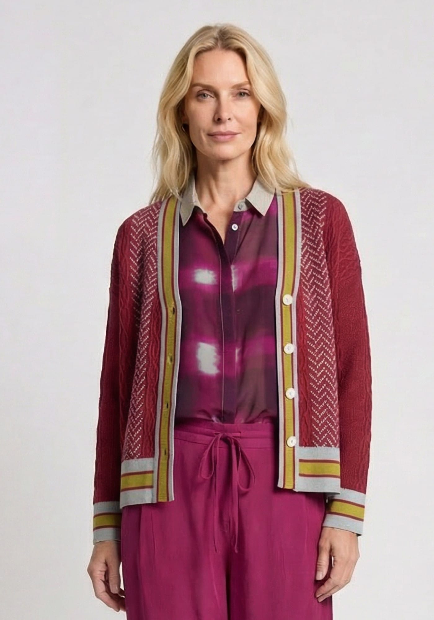 A sophisticated sporty-look cardigan crafted in Silk and Cotton, featuring an interplay of jacquards and fine cables. The club-striped ribbed band adds a distinctive detail.