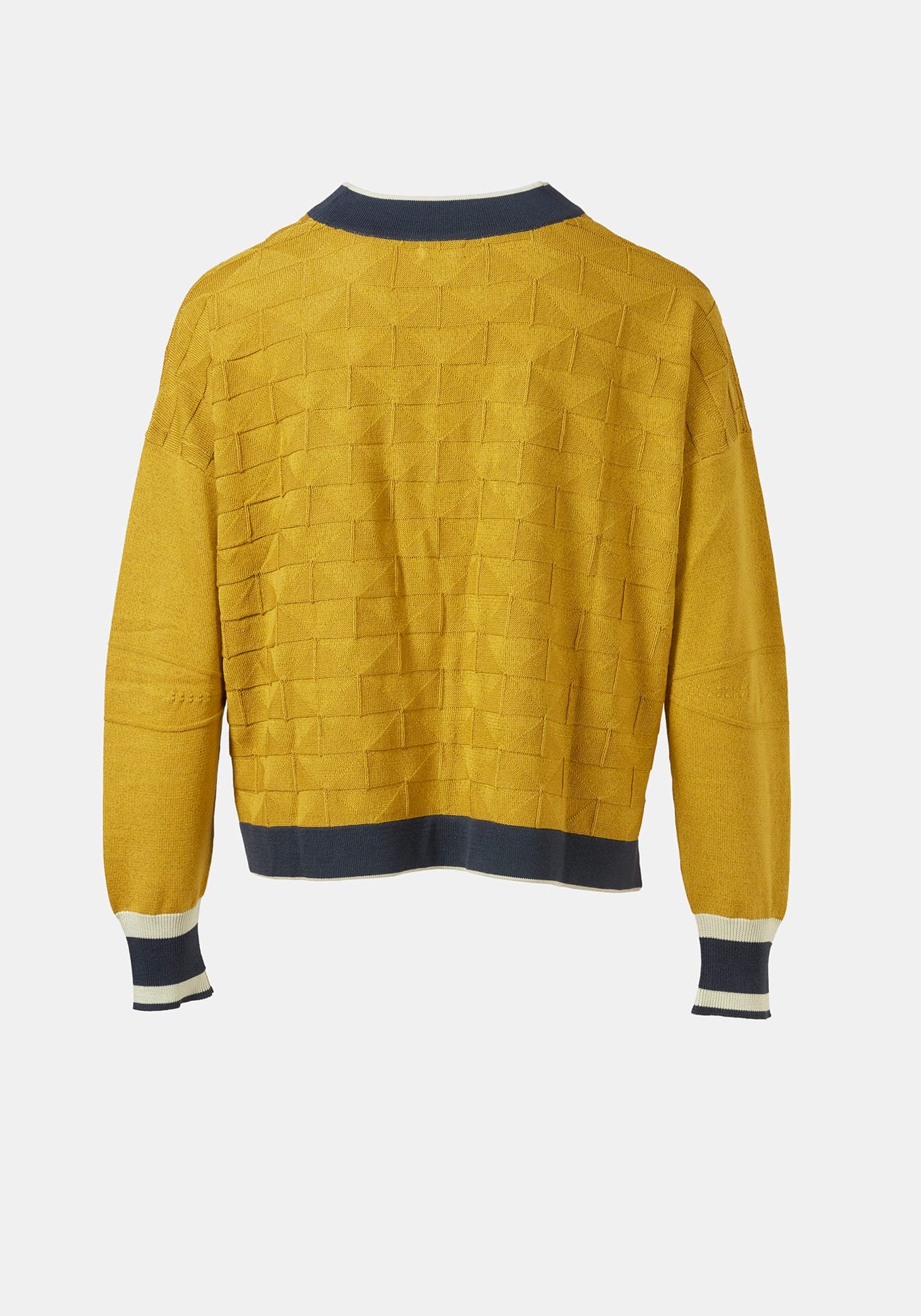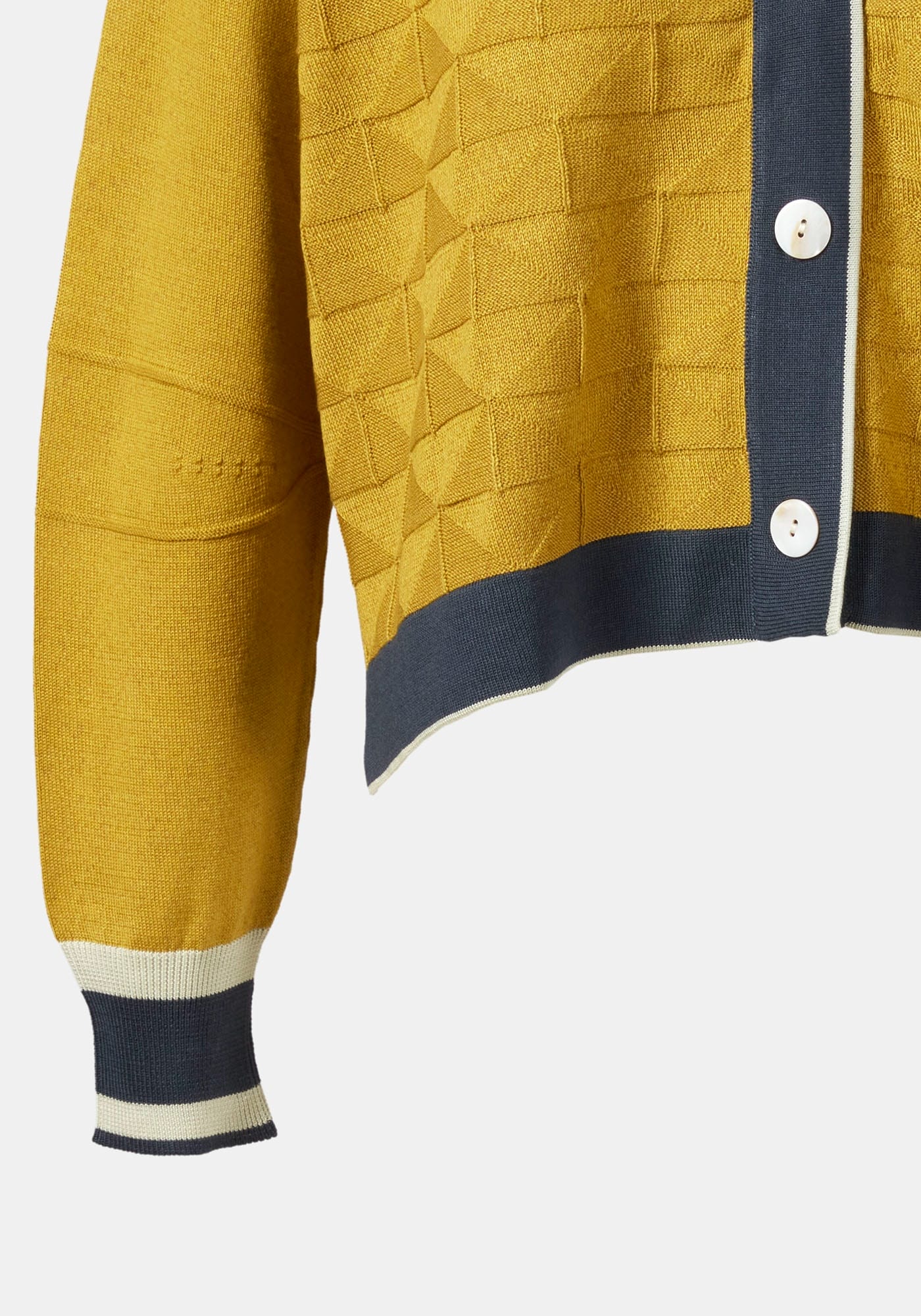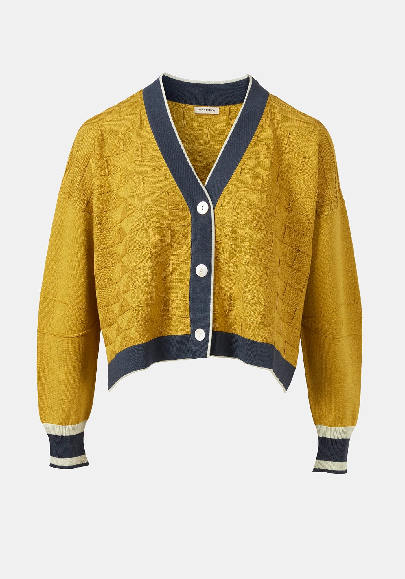 Sophisticated knitted jacquard button up cardigan featuring lighther sleeves, stripes contrasting button placket and cuffs. Small knittining details enhace the style and quality of the piece.