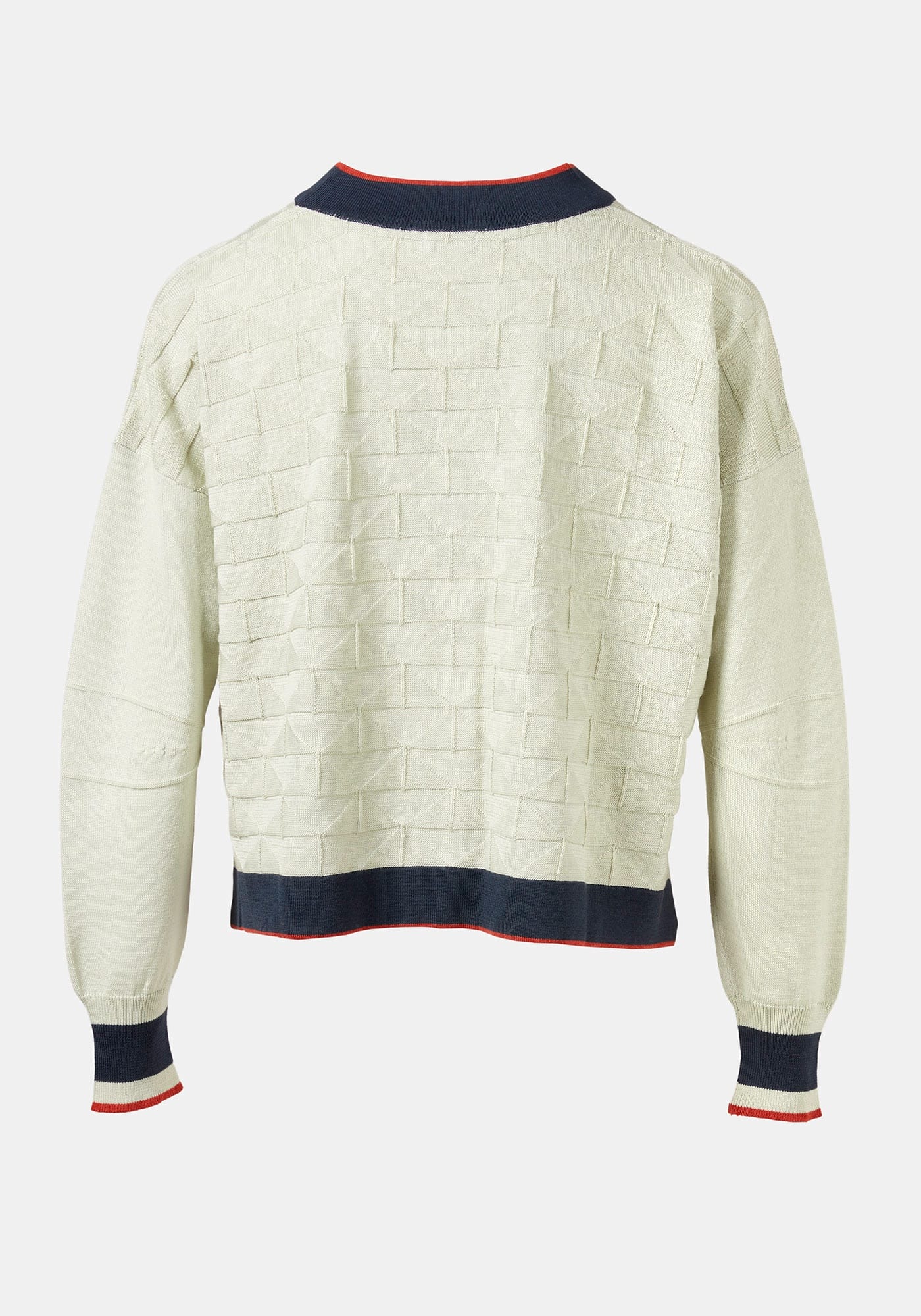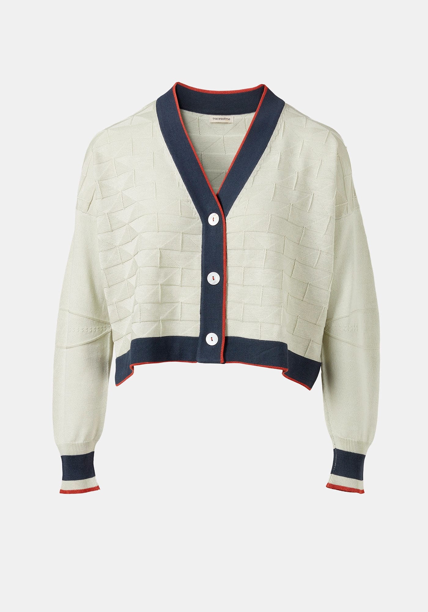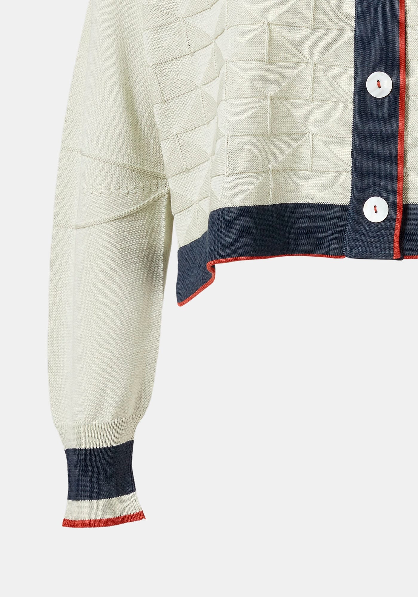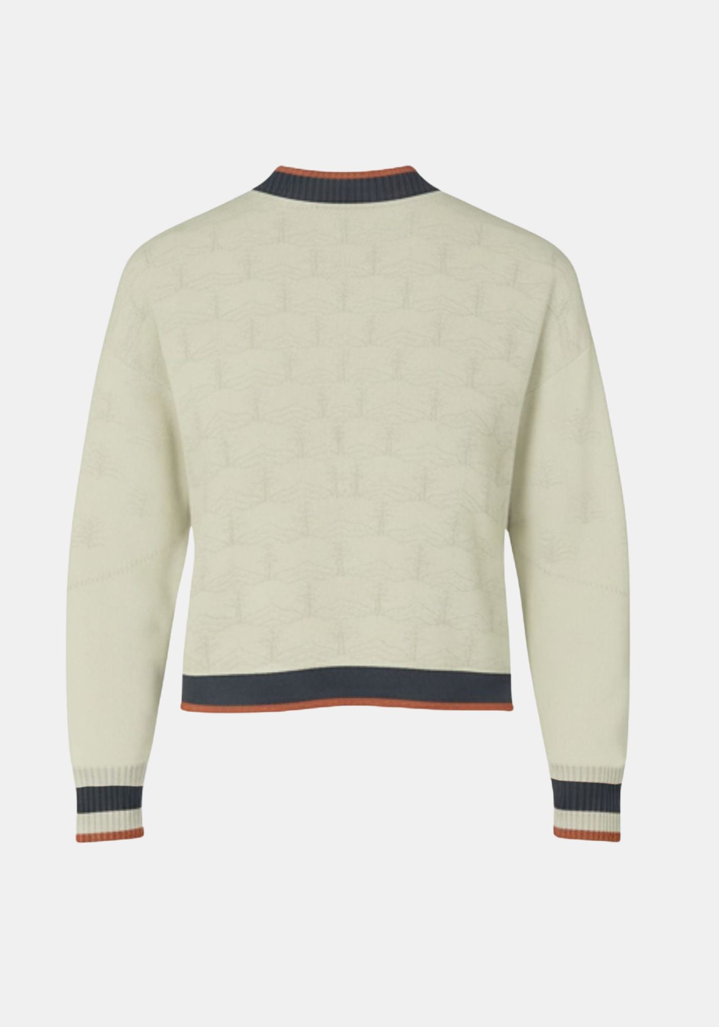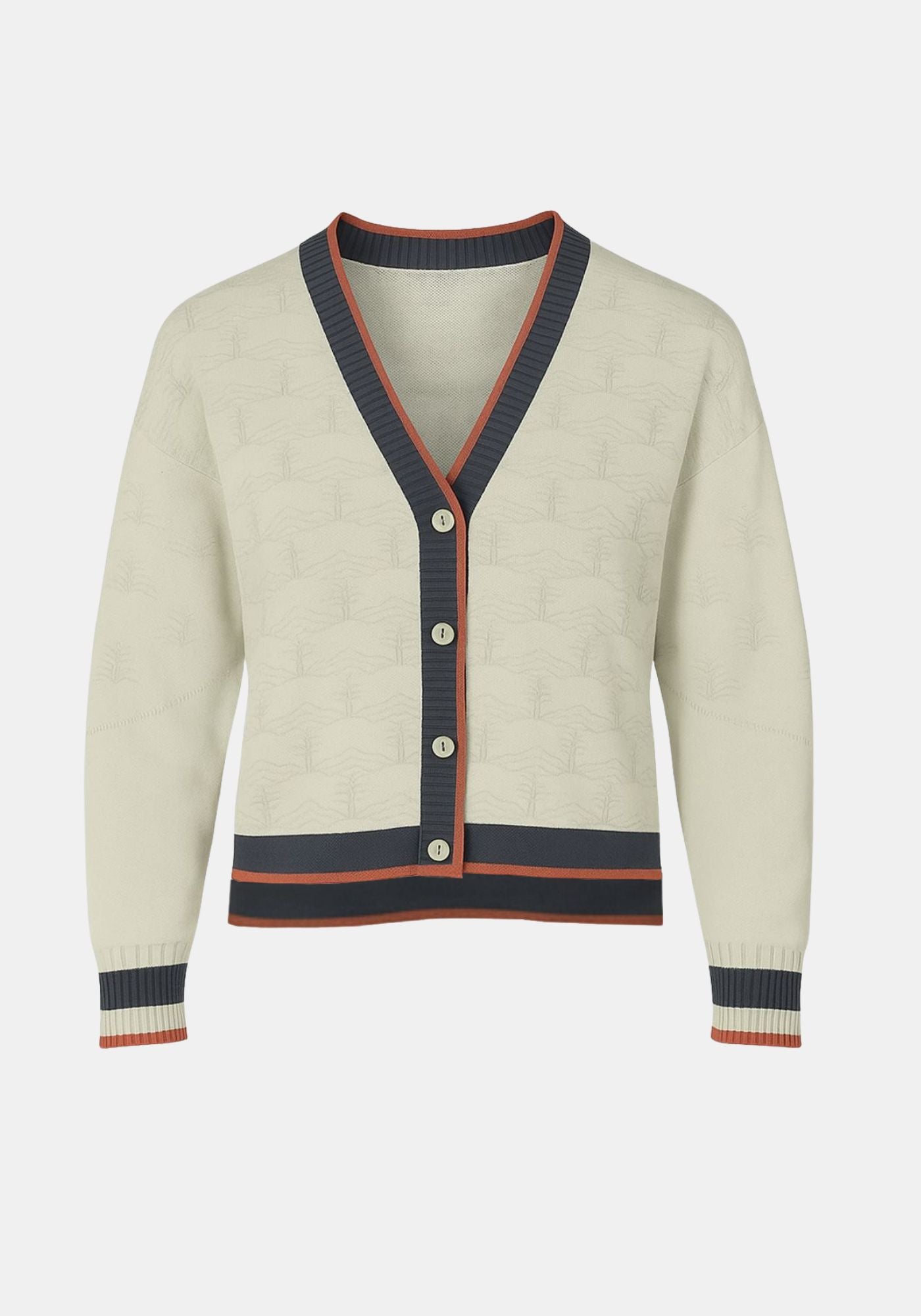 Sophisticated knitted jacquard button up cardigan featuring lighther sleeves, stripes contrasting button placket and cuffs. Small knittining details enhace the style and quality of the piece.