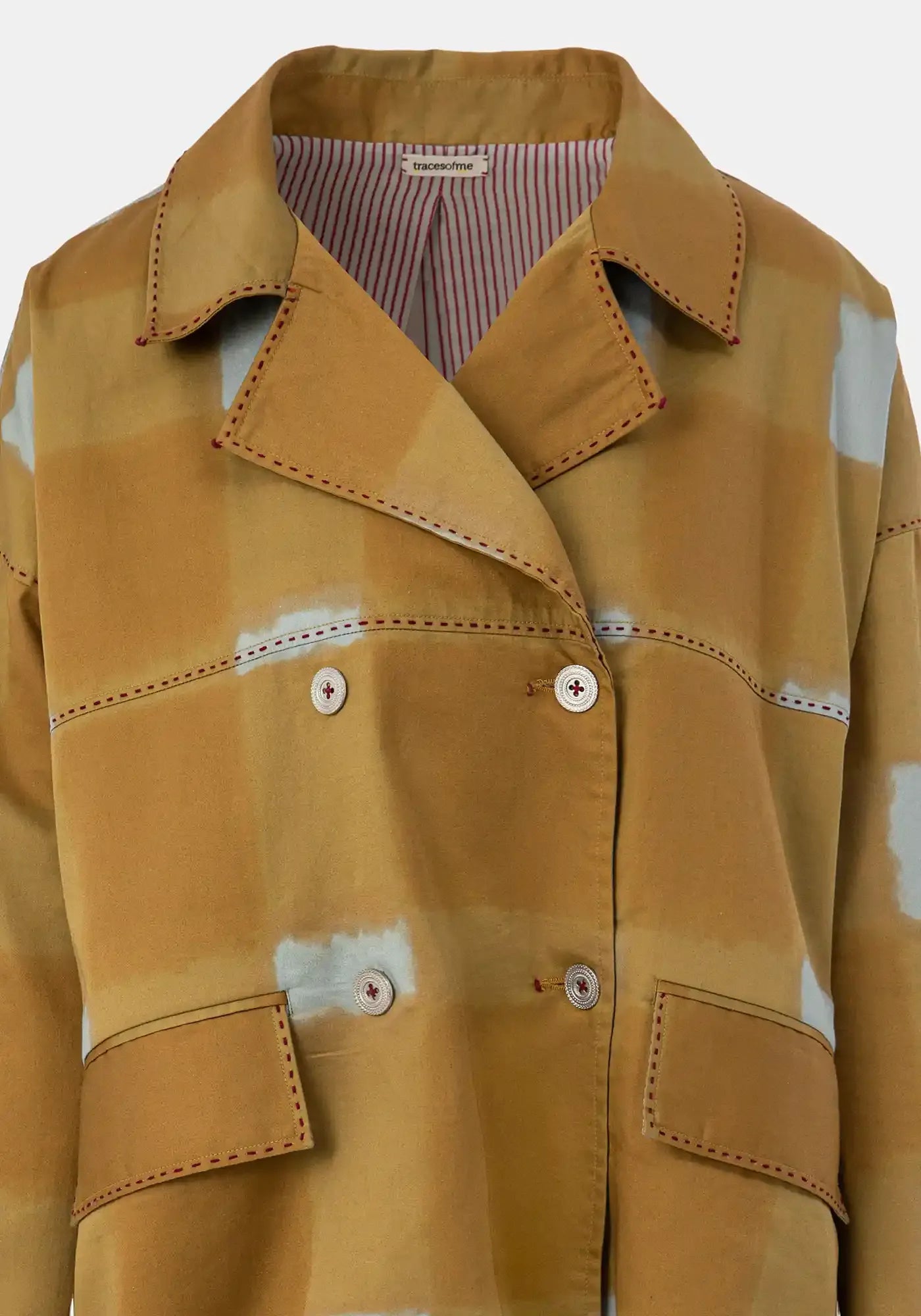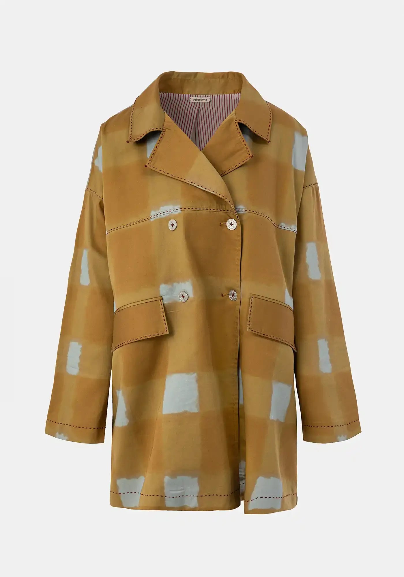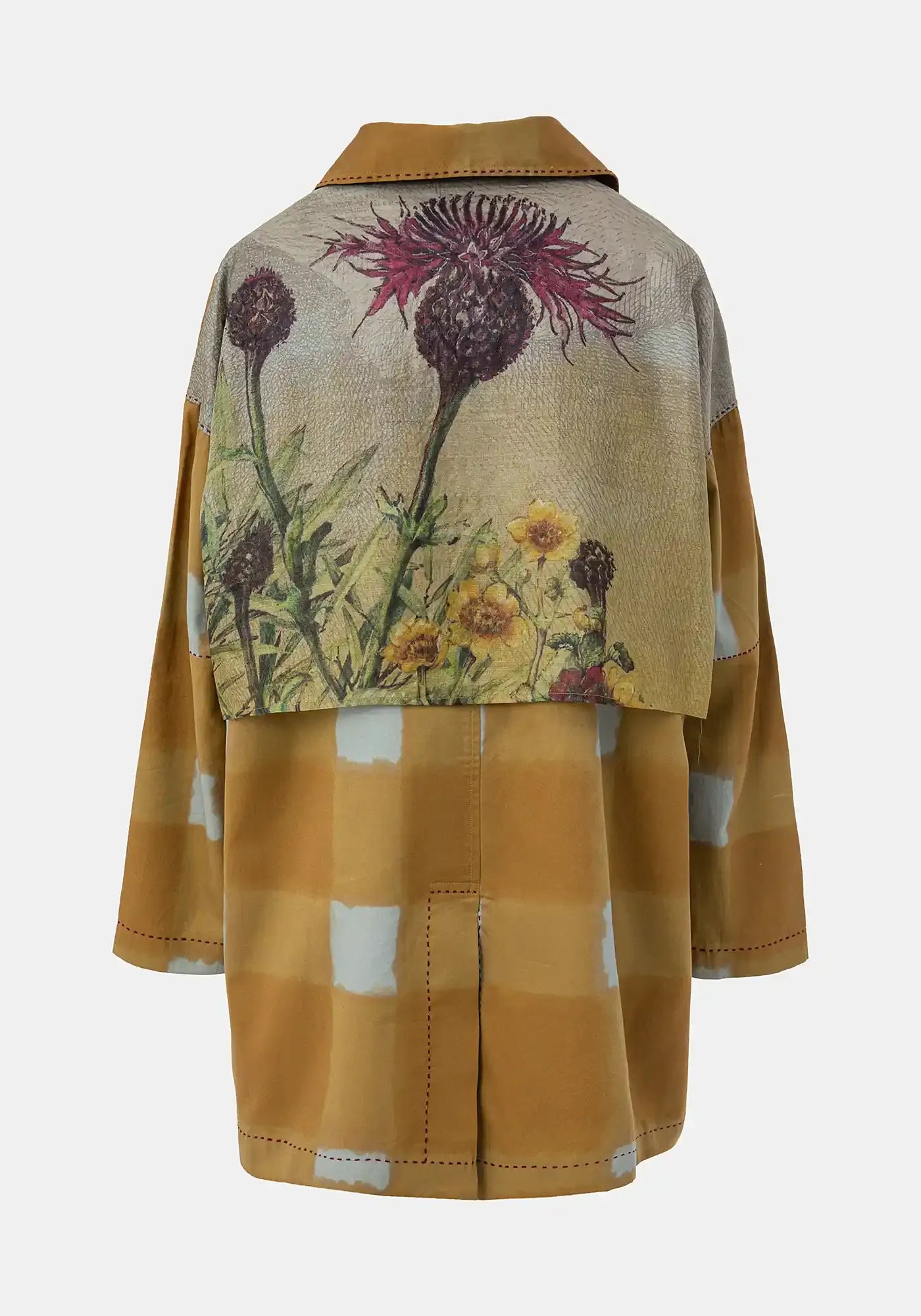 Double breasted silk liningless coat featuring an exclusive TM digital allover print highlighted by a floral placement back flap multicolour print. Patch front pockets, MOP button fastening and antique gold top metllic stitches refine this everyday piece. Embroidered logo.