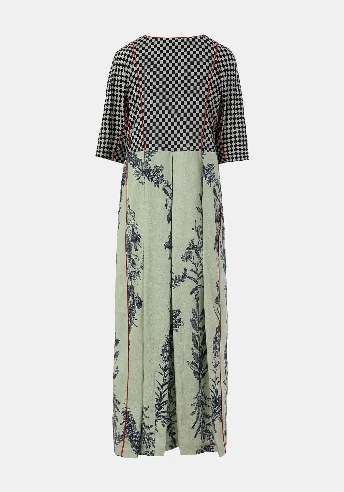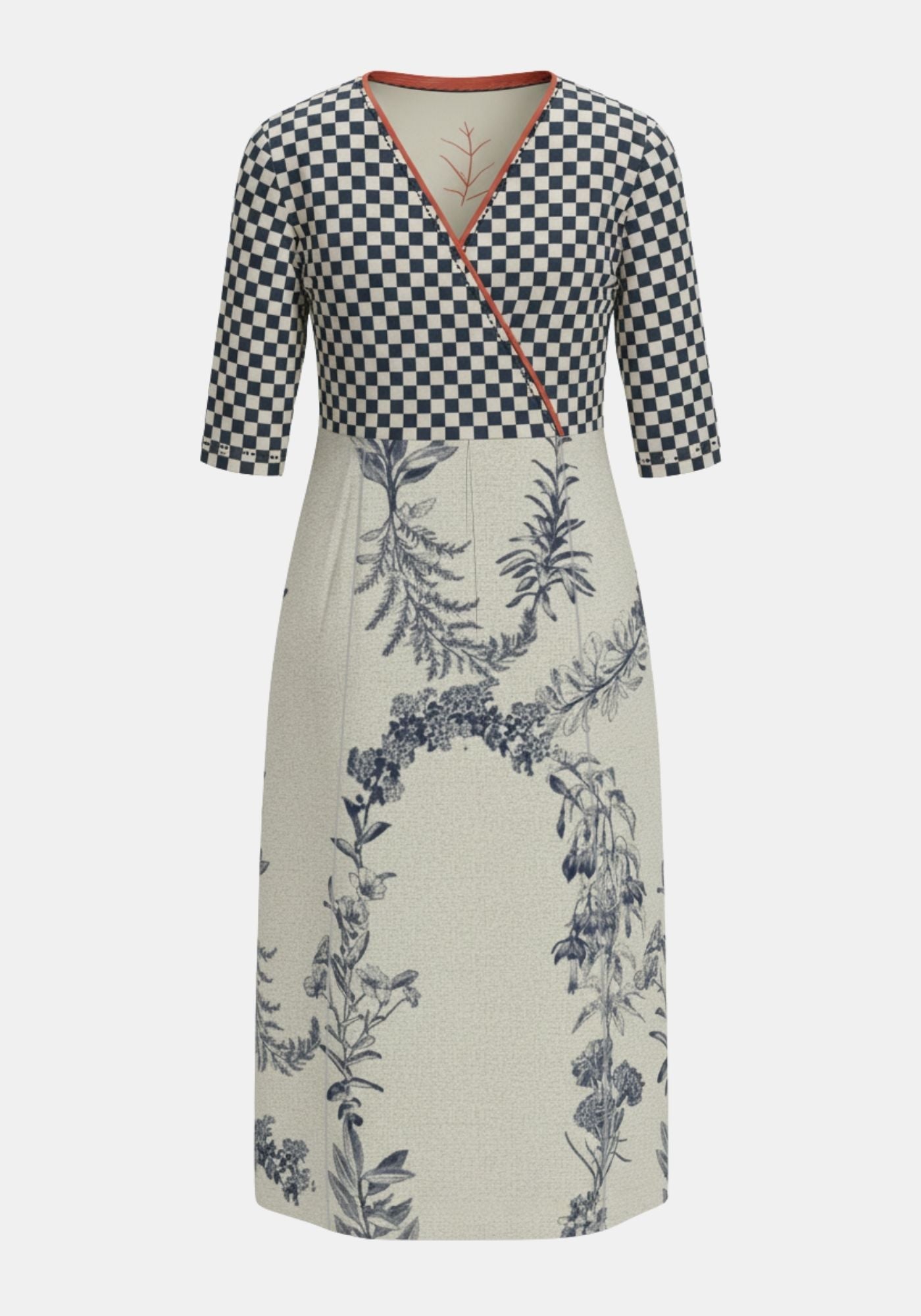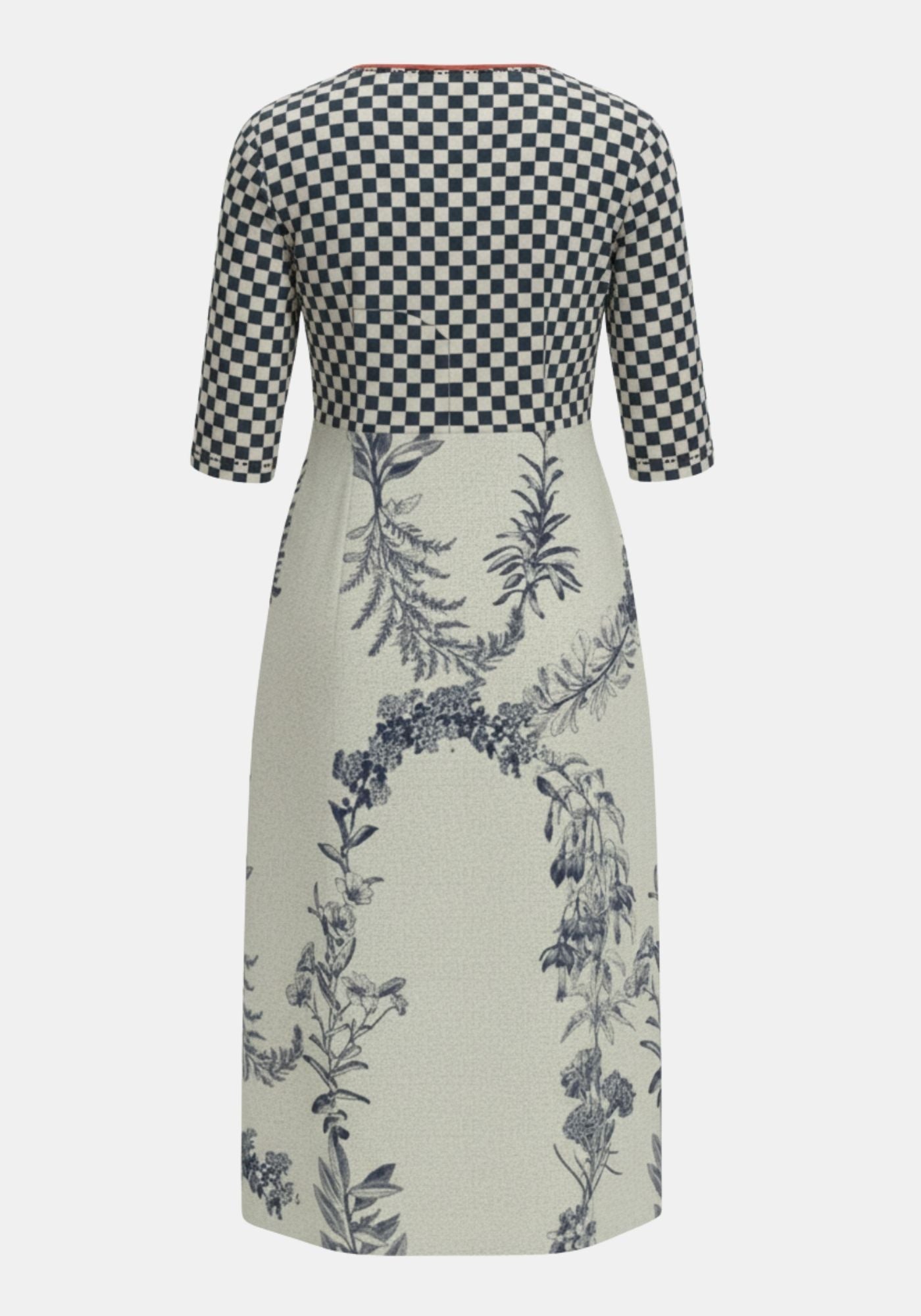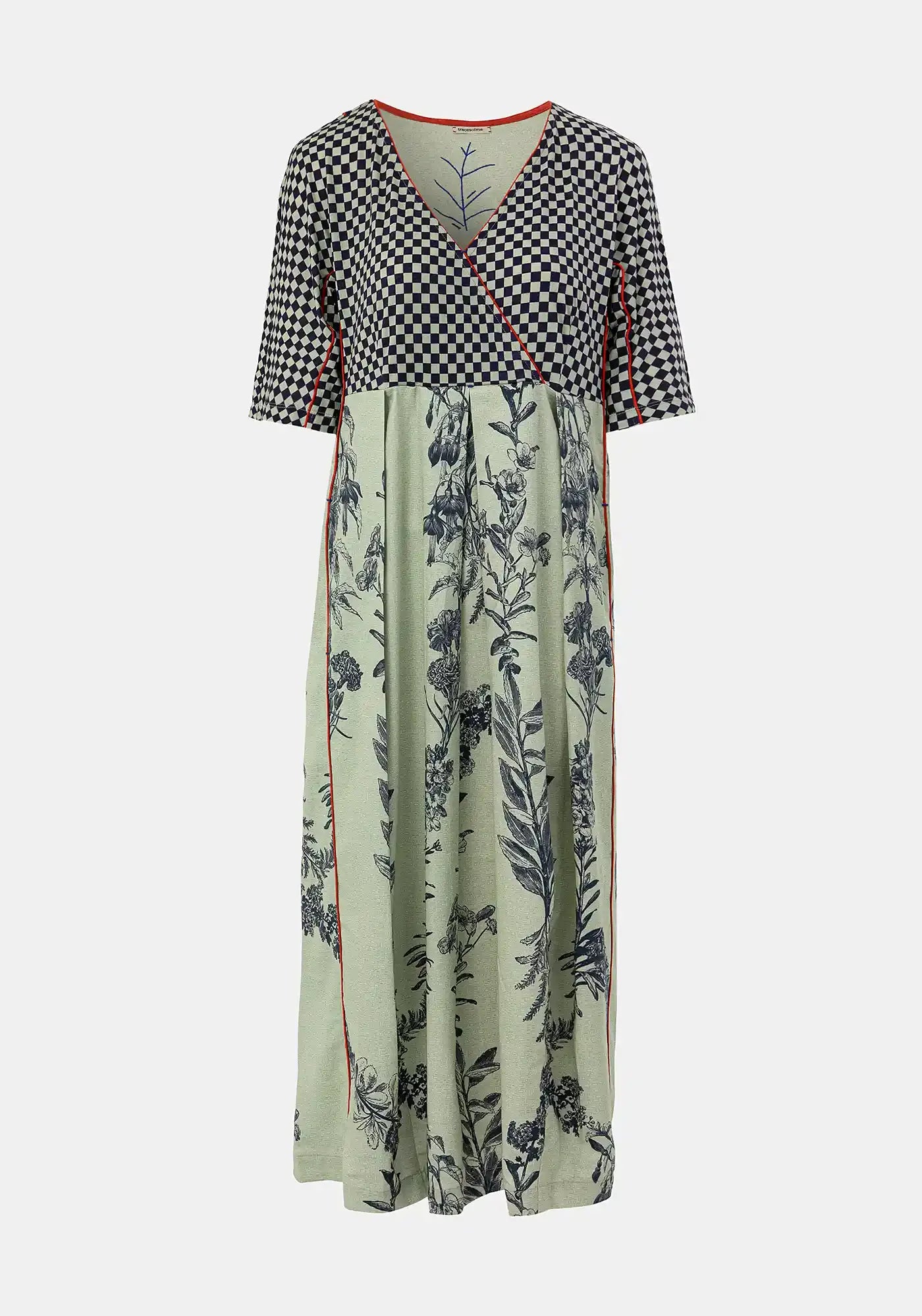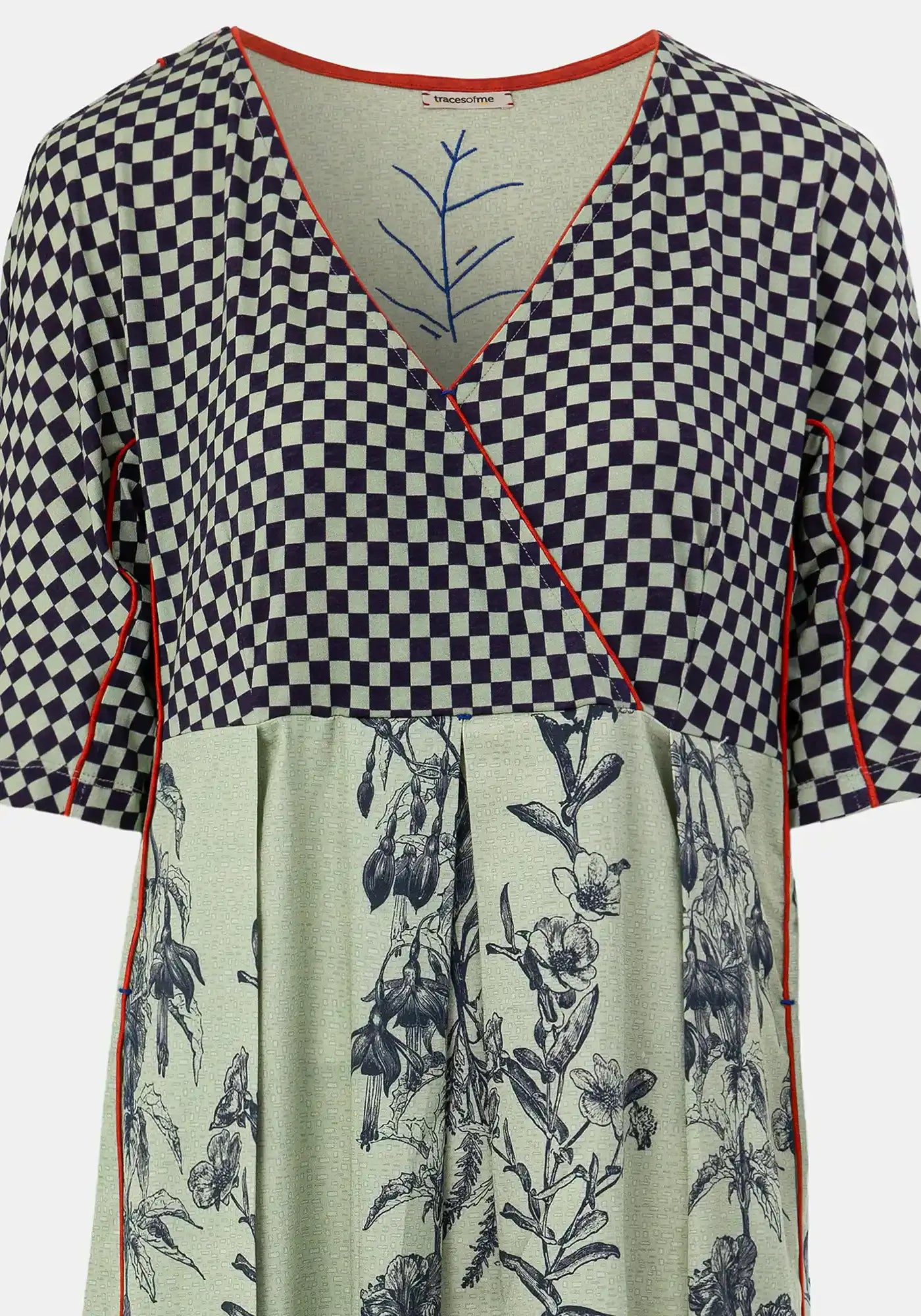 Double-breasted neckline dress featuring a cotton jersey top with short sleeves & cotton satin skirt w/ front and back deep pleats in exclusive TM digital mix of prints. Half moon and pippings in contrast color give a special twist to the piece. Embroidered logo.