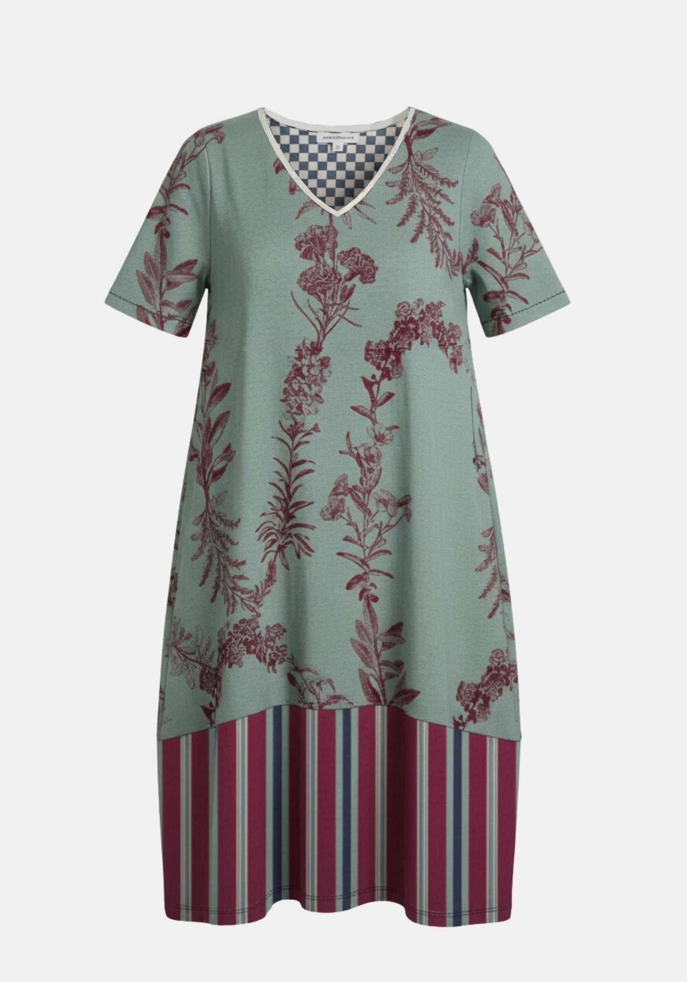 Cotton jersey dress with V neck, short sleeves, rounded shape skirt and side pockets. Featuring a mix of TM exlusive digital prints and contrast neckline pipping. Hand kanta stiches on waist and bottom layer, embroidered logo at back.
