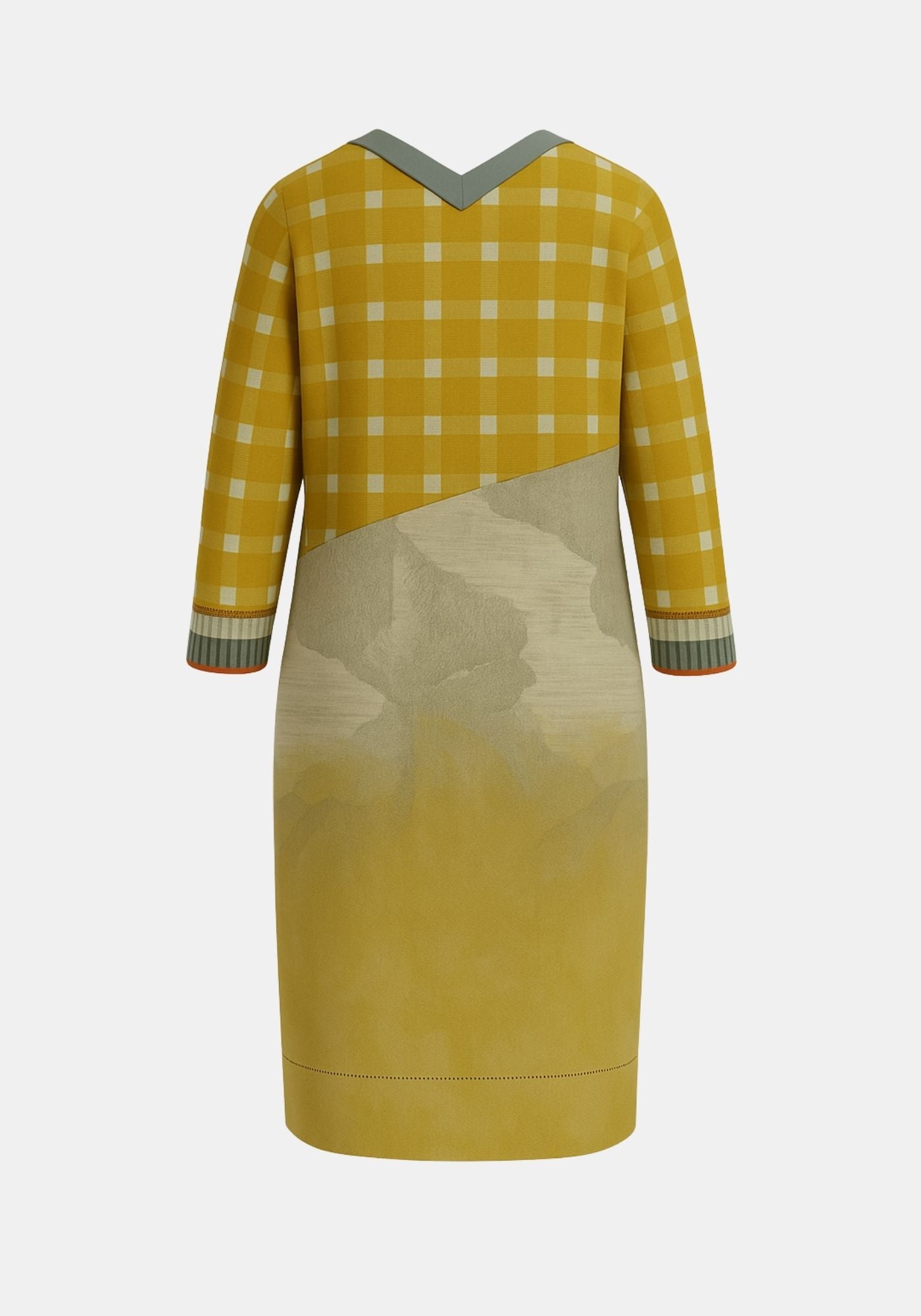 Cotton jersey dress with V neck, 3/4 sleeves, rounded shape skirt and solid tonal front welt pocket and neckline. Featuring a mix of TM exlusive digital prints. Silk knitted cuffs give a twist to this piece. Embroidered logo at back.