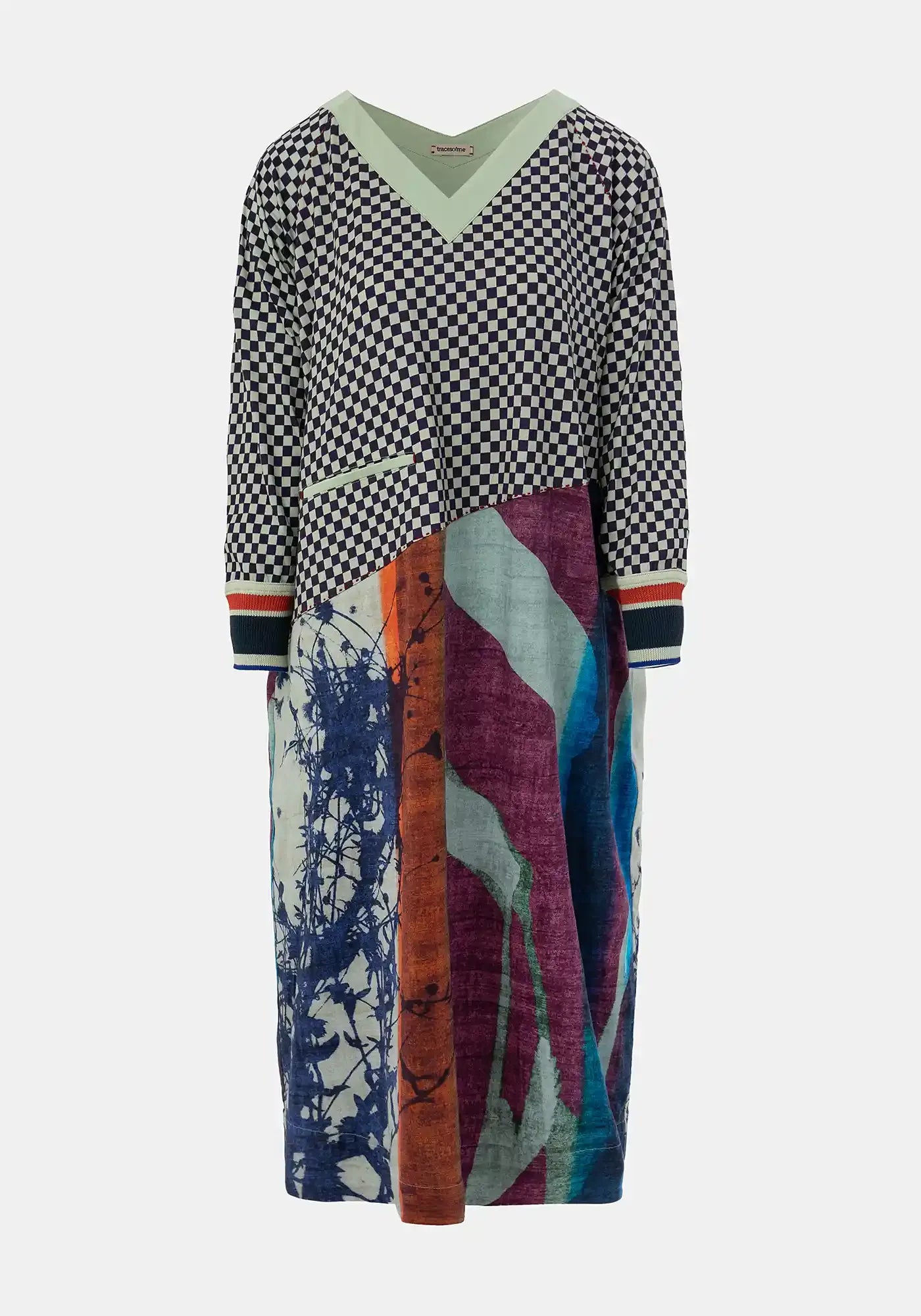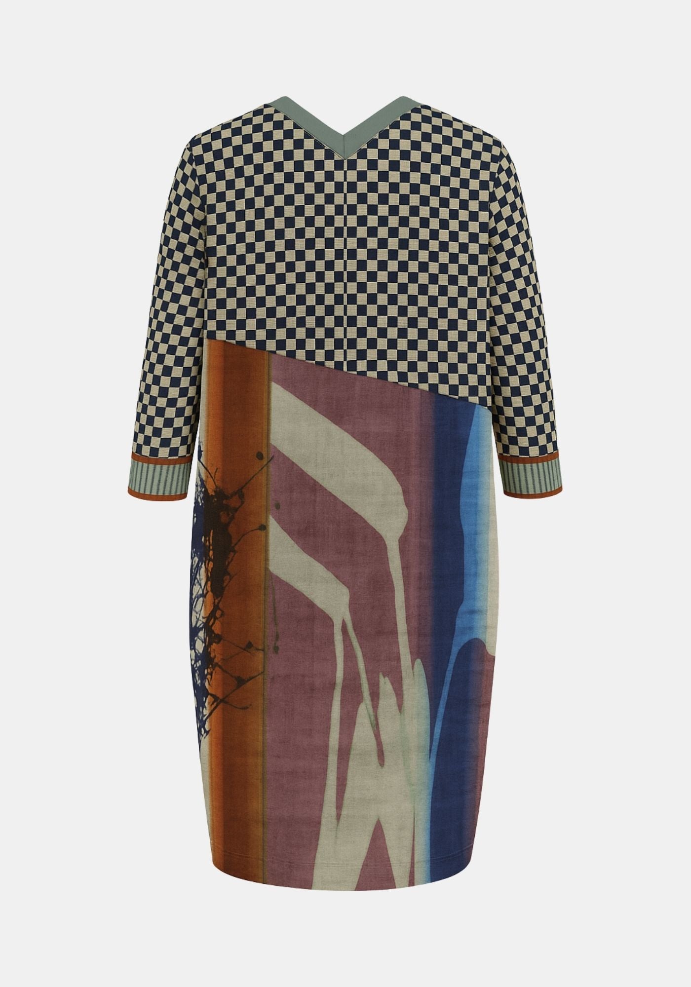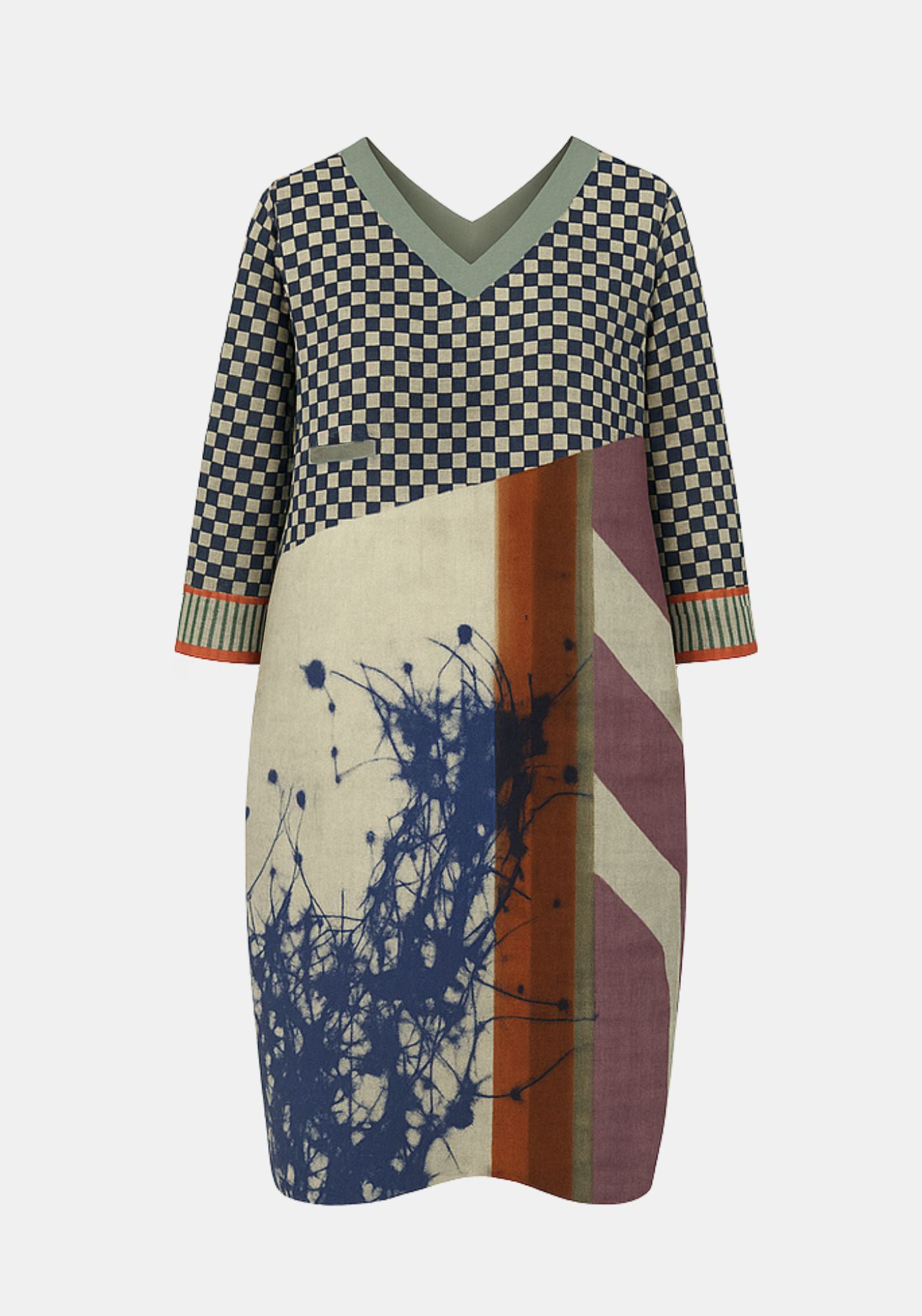 Cotton jersey dress with V neck, 3/4 sleeves, rounded shape skirt and solid tonal front welt pocket and neckline. Featuring a mix of TM exlusive digital prints. Silk knitted cuffs give a twist to this piece. Embroidered logo at back.