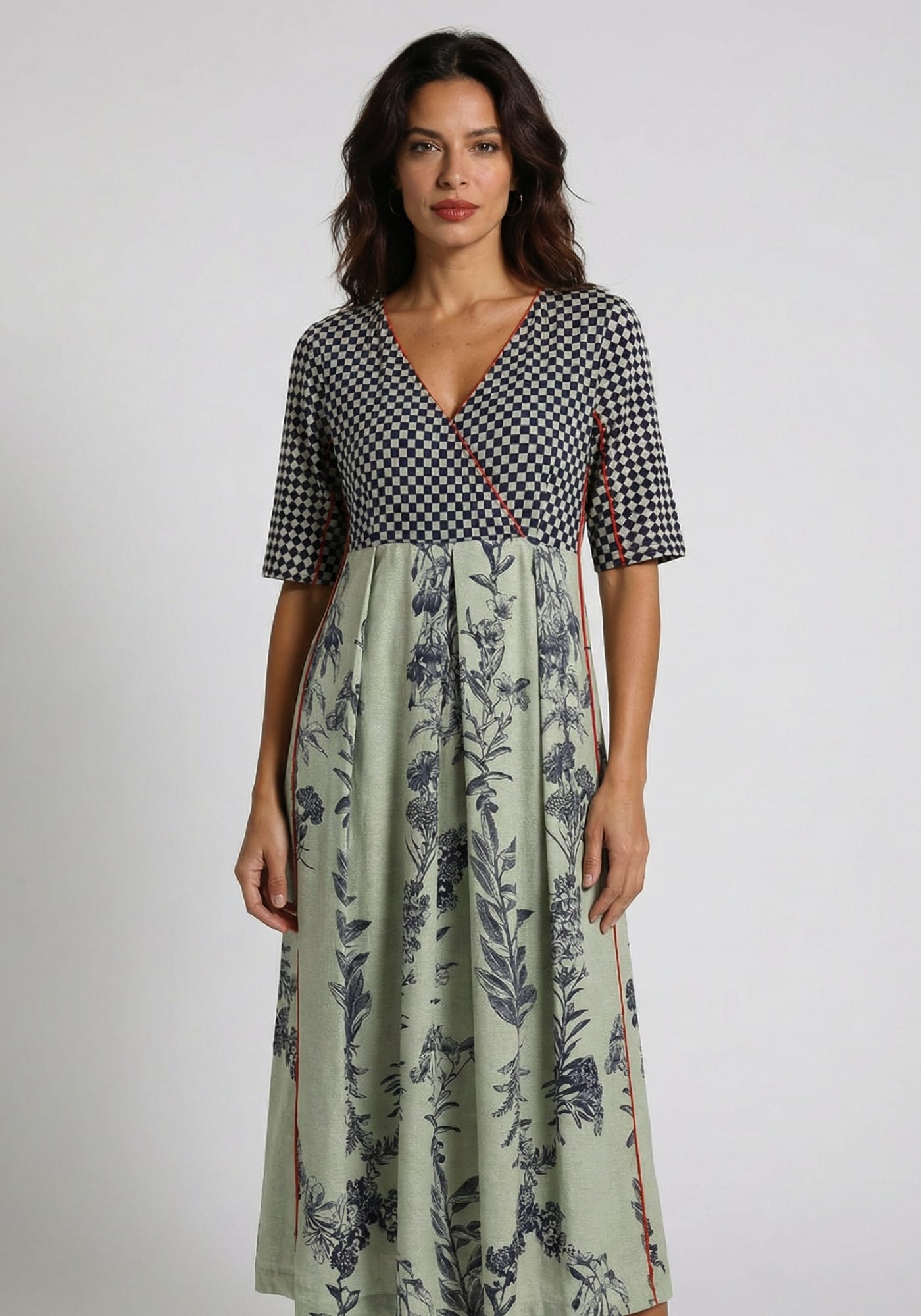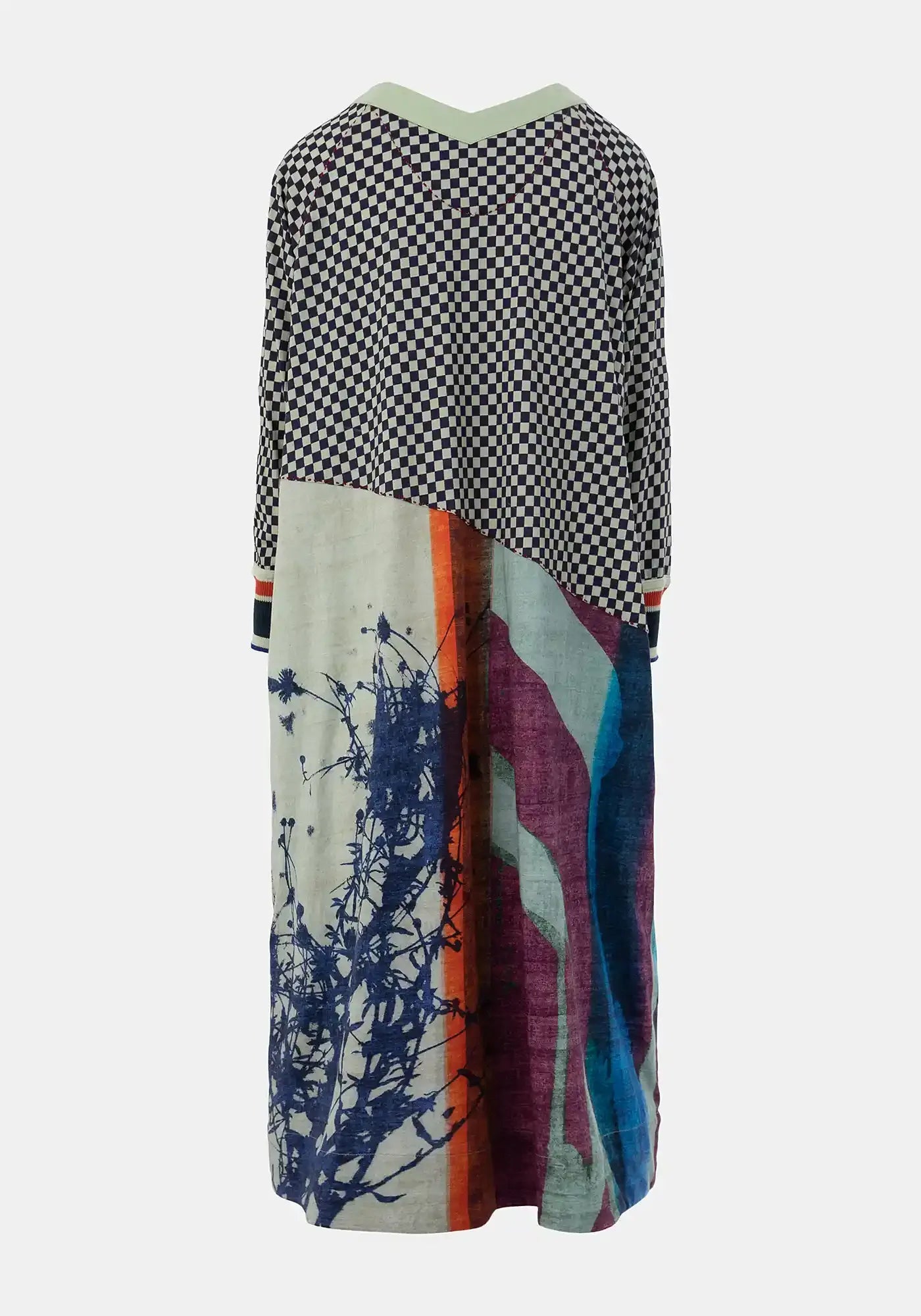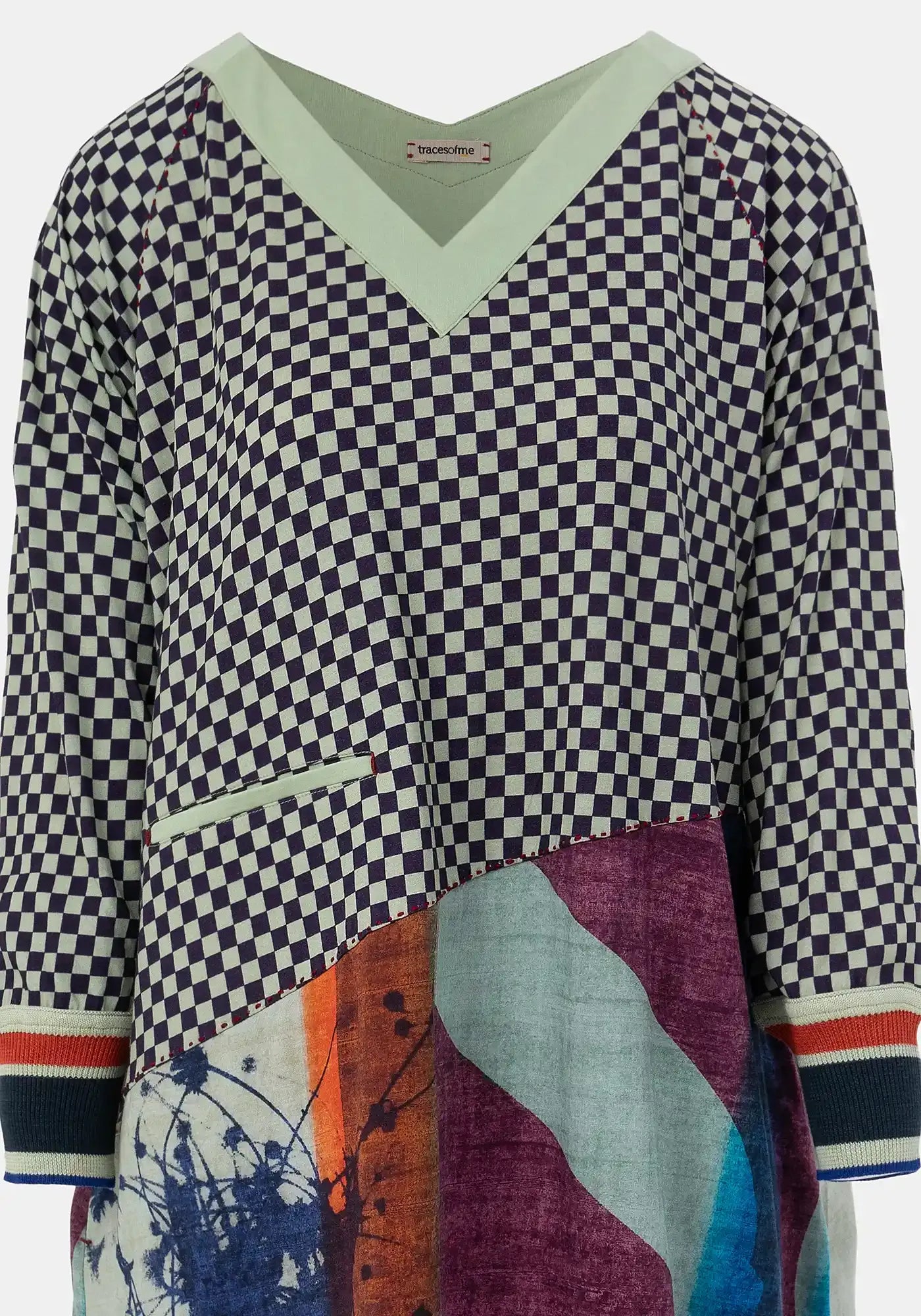 Cotton jersey dress with V neck, 3/4 sleeves, rounded shape skirt and solid tonal front welt pocket and neckline. Featuring a mix of TM exlusive digital prints. Silk knitted cuffs give a twist to this piece. Embroidered logo at back.