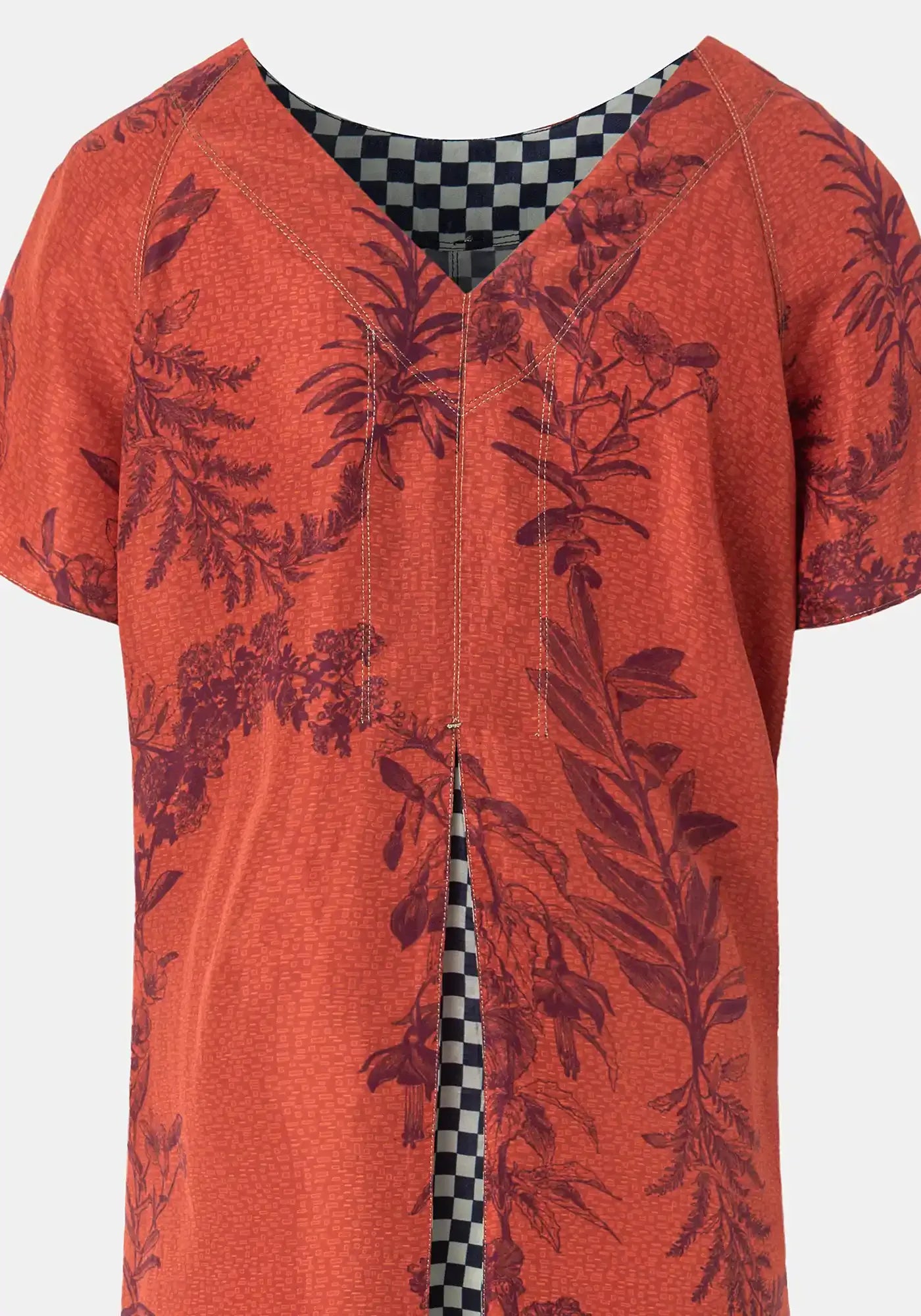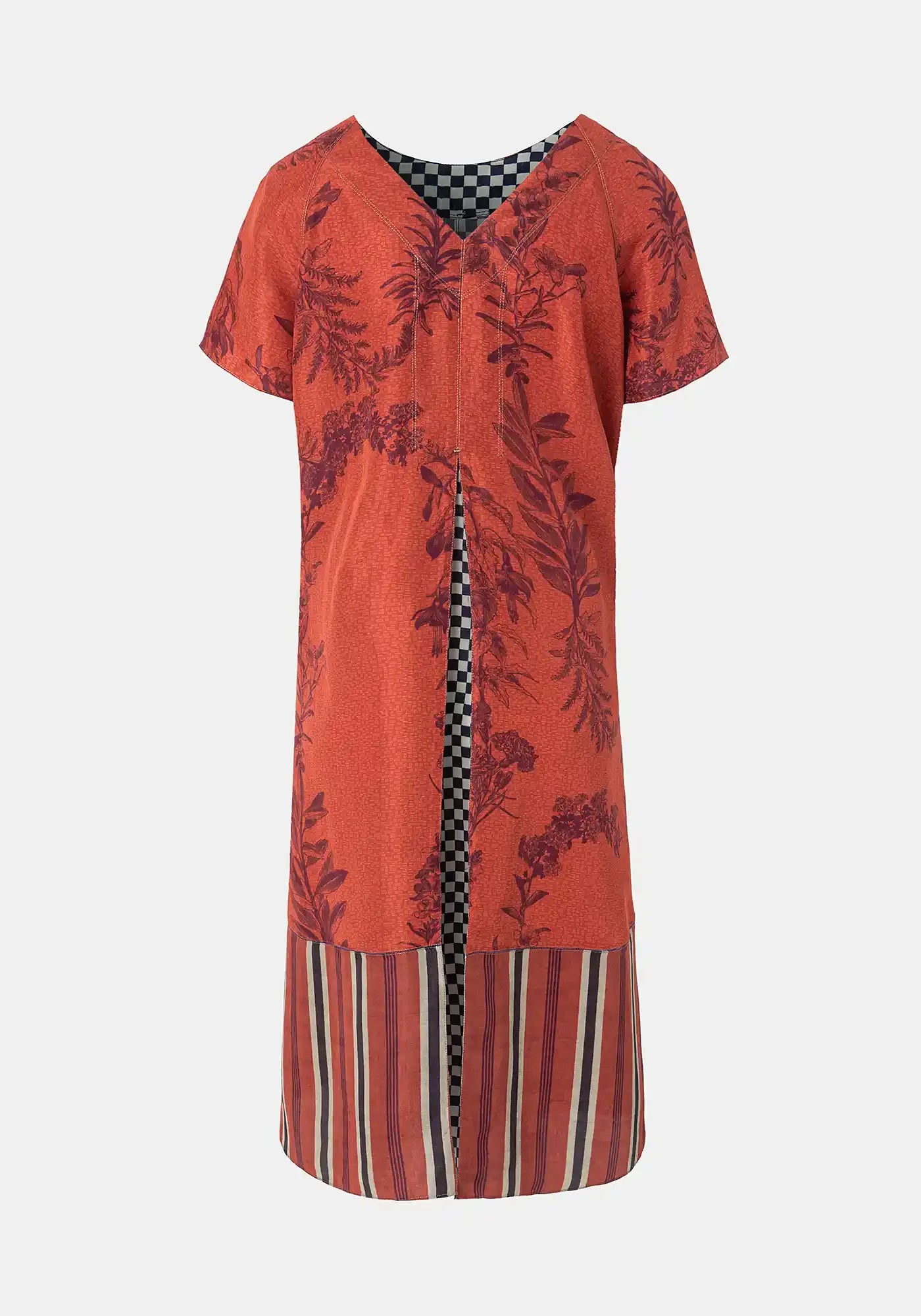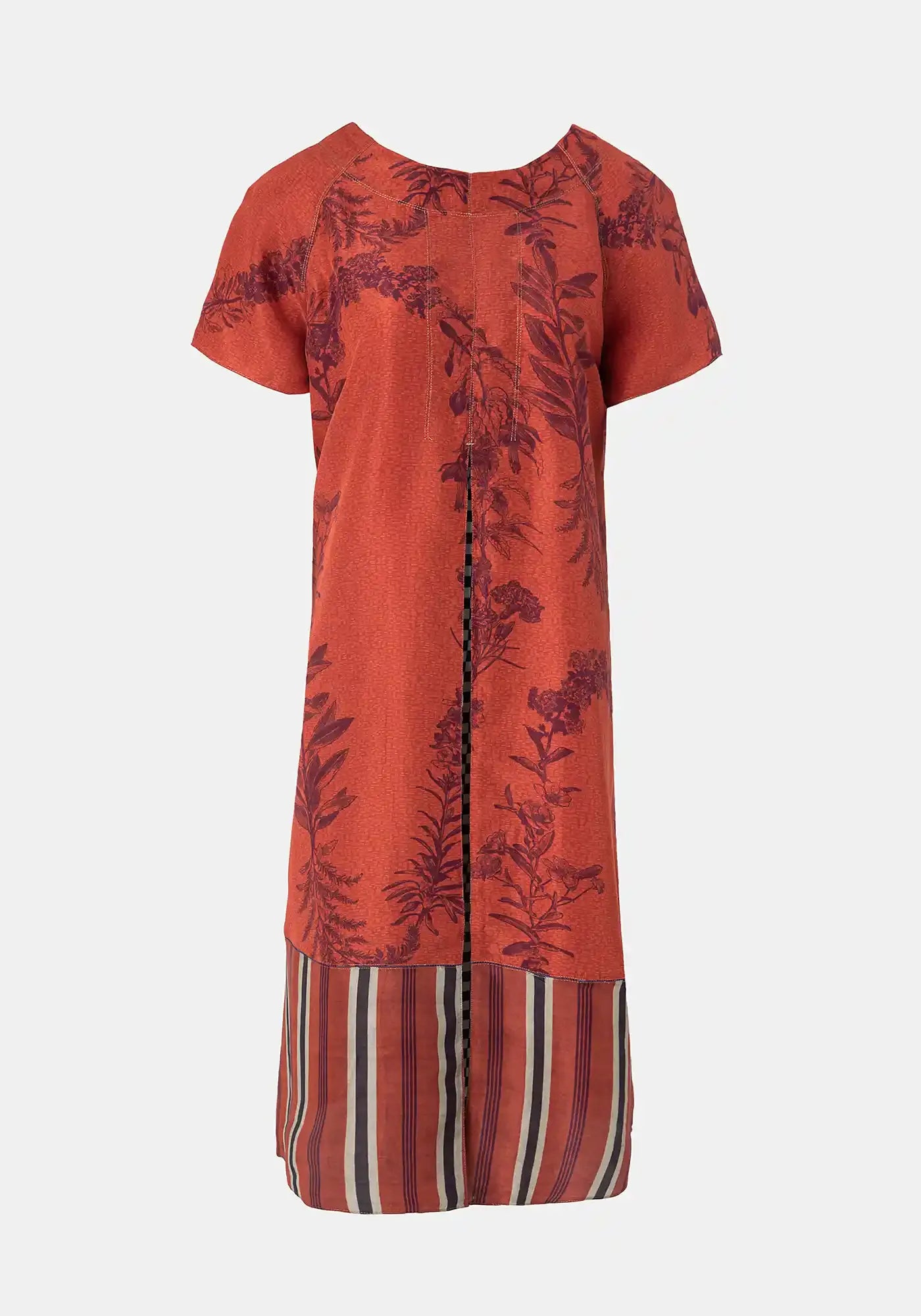 Iconic TM Dress style featuring a mix of Silk TM exclusive digital prints & delicate ajours contrasting stitches on a classic A line shape and reglan short sleeves. Front and back box pleats give the desired fluidity to this every ocasion dress. Embroidered logo.