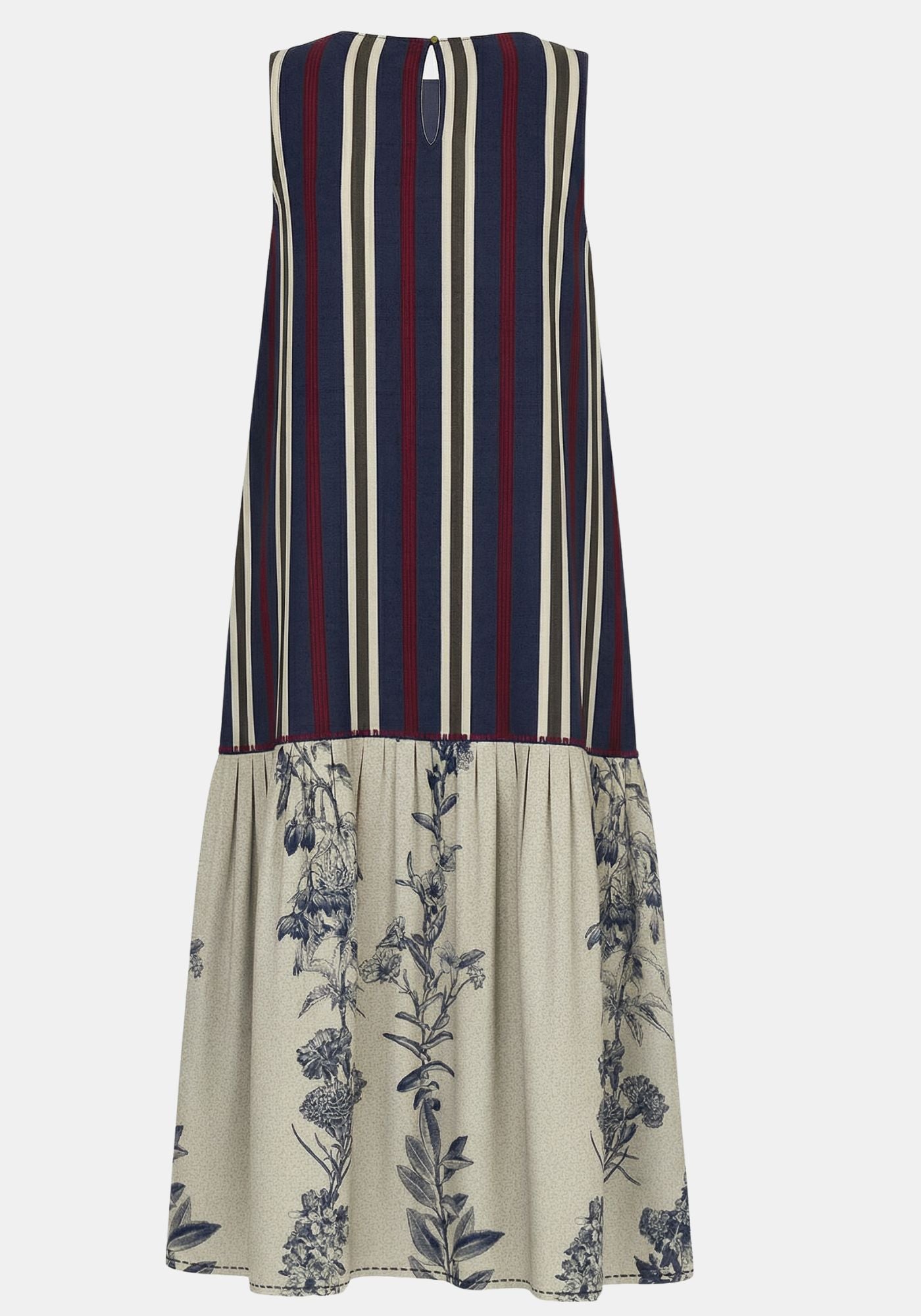 Chanderi layered sleeveless dress featuring exclusive TM digital prints duet highlighted by a solid inner and contrasting Ajour stitches details. Logo embroidered at back.