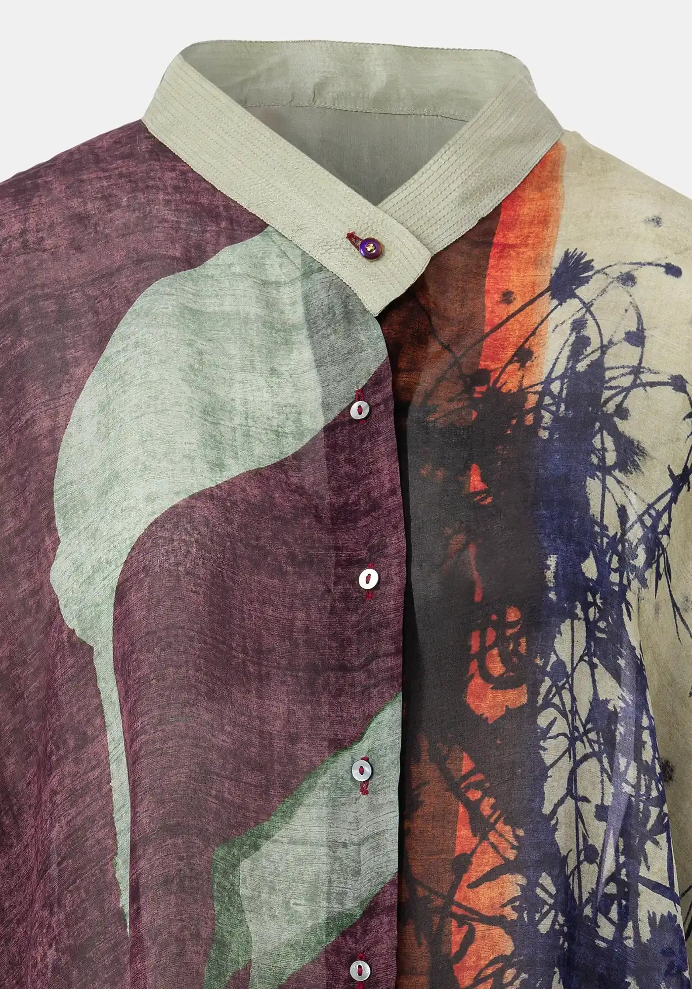 Oversized silk georgette, mother of pearl buttoned up shirt featuring a TM exclusive digital print. Banded silk collar with close running metallic stiches and one metallic button. Side slits, solid facings, top metallic stitches, embroidered logo and contrasting ajours enhance the piece.