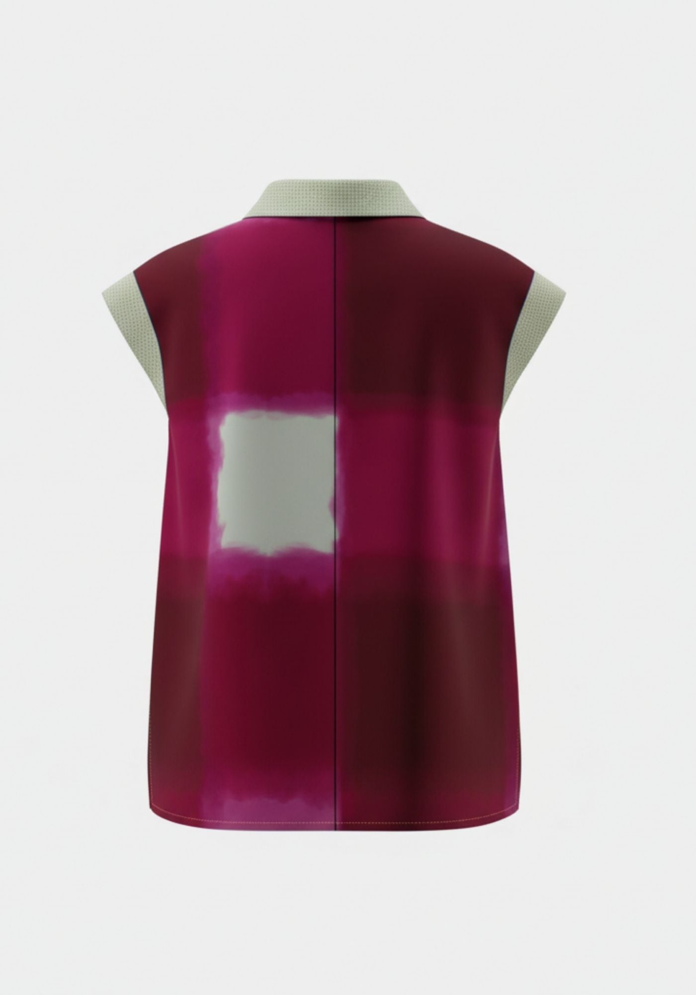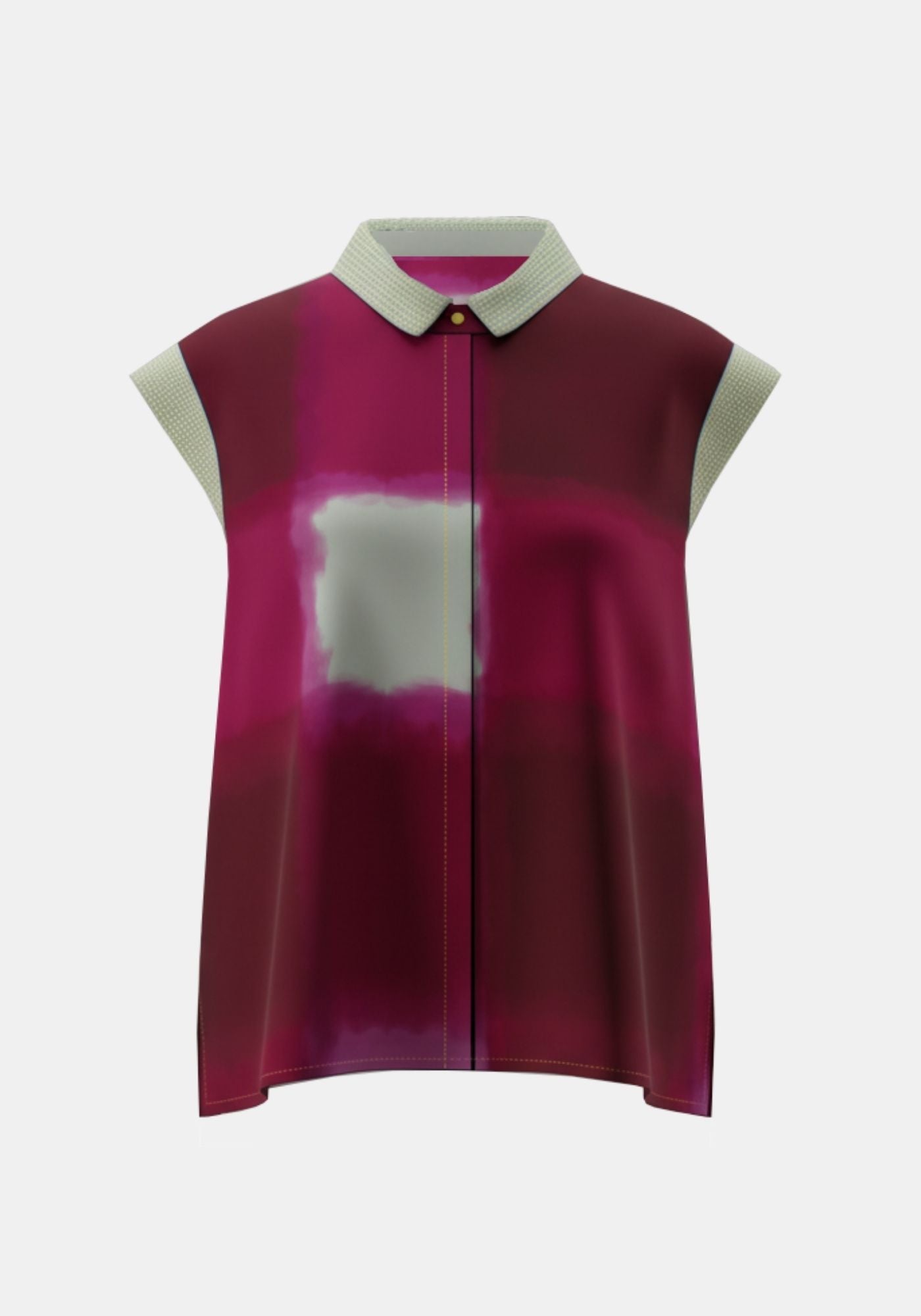 Silk A-line shirt featuring a digital printed TM exclusive design,with a contrast silk collar and cap sleeves with close running metallic stitches for a special look. Back box pleat for extra confort and conceled fastening up with MOP buttons. Embroidered logo on halfmoon.
