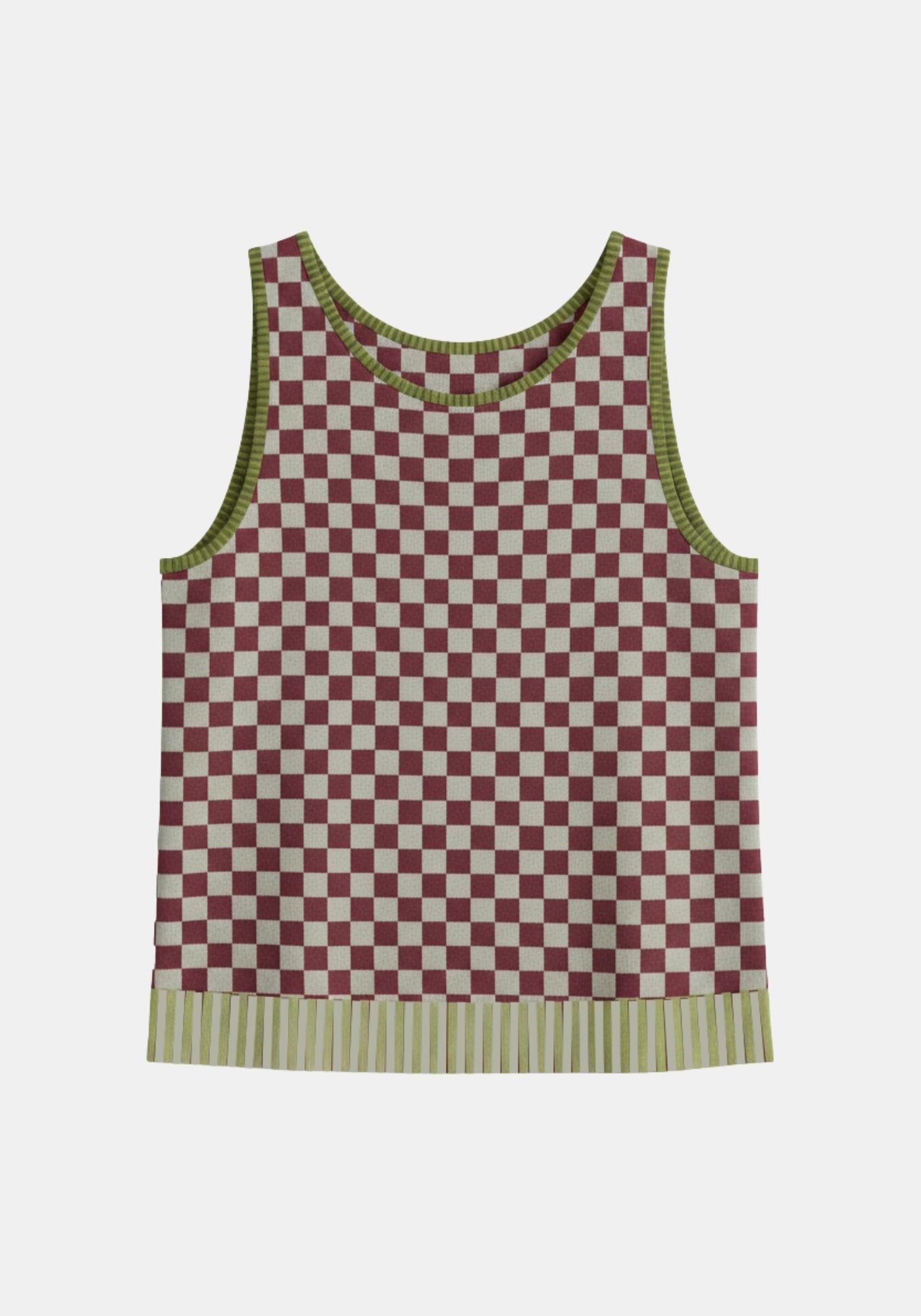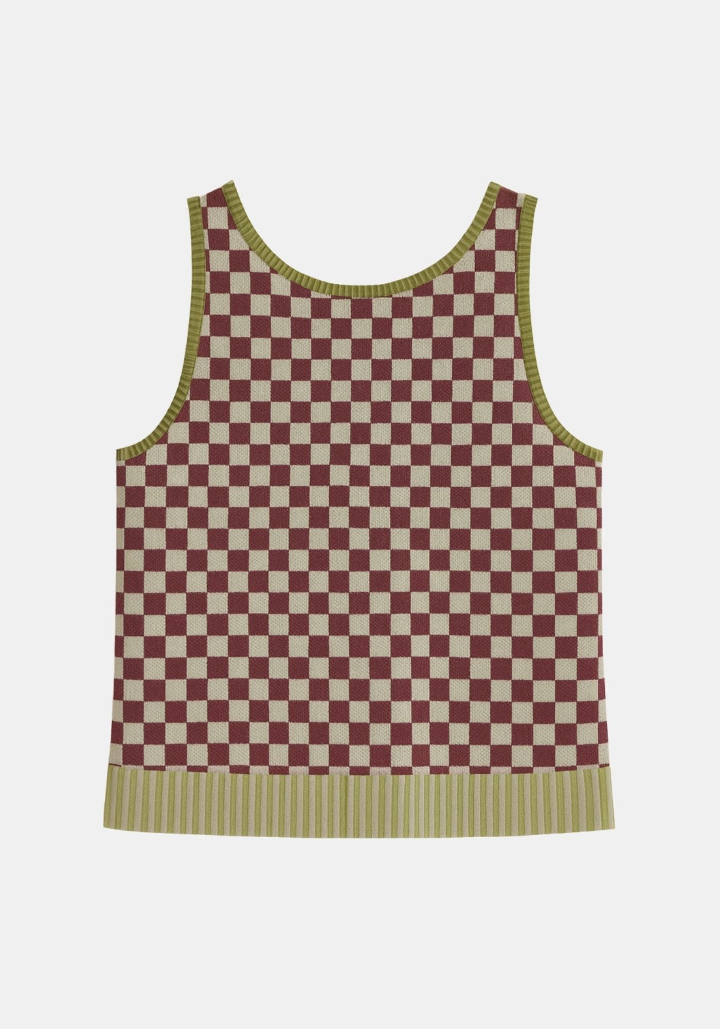Silk and cotton blend knitted skeveless top featuring mini checks pattern in two colors. Contrasting tubular knitted round neckline, cuffs and bottom hem.